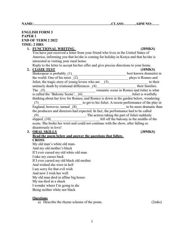 Form 3 English Paper 1 End of Term 2 Examination 2022