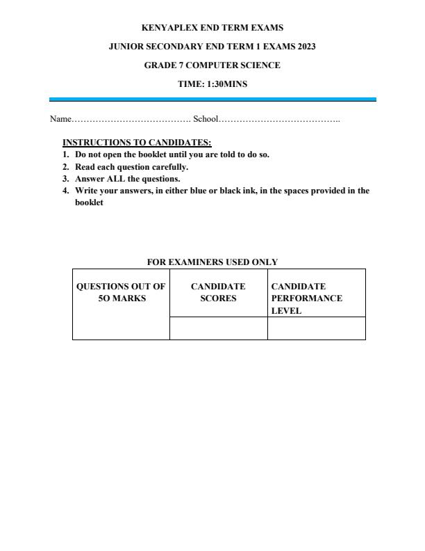 Grade 7 Computer Science End of Term 1 Examination 2023