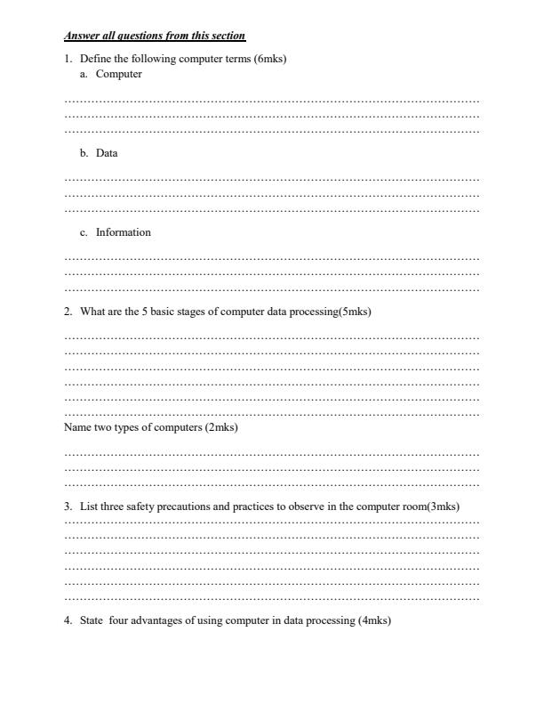 Buy Grade 7 Computer Science End of Term 1 Examination 2023 in both Pdf and Ms Word formats. Contains marking scheme.