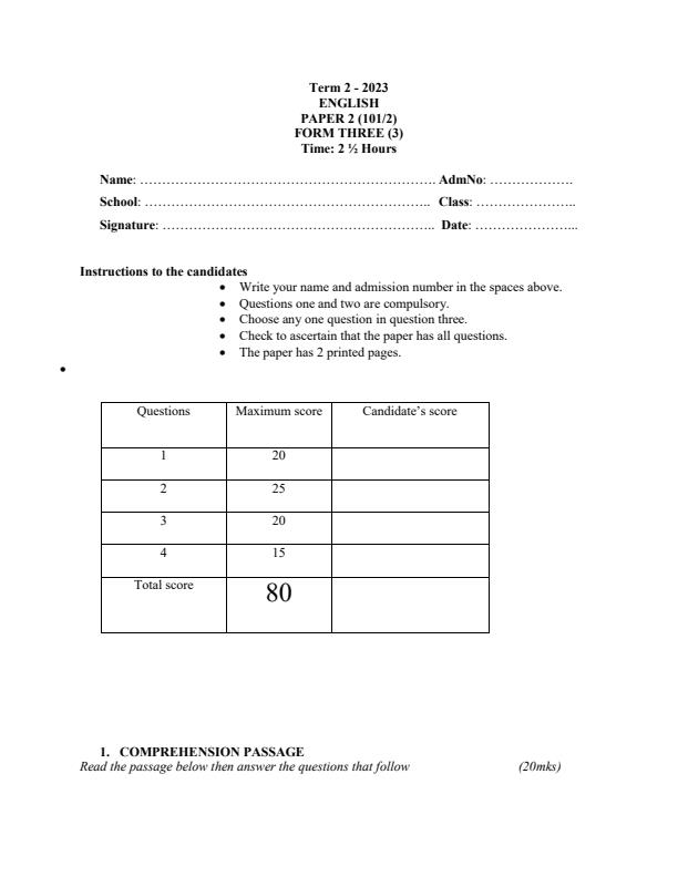 Form 3 English Paper 2 End of Term 2 Examination 2023