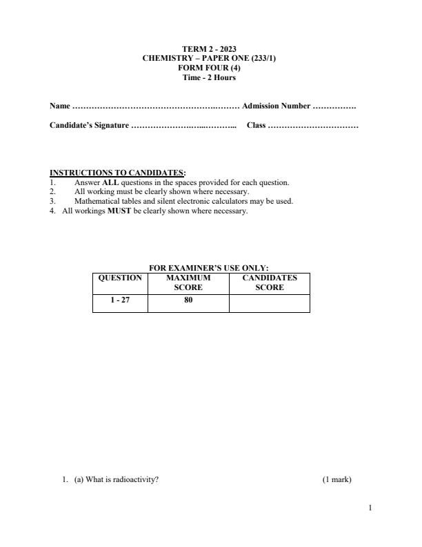 Form 4 Chemistry Paper 1 End of Term 2 Examination 2023
