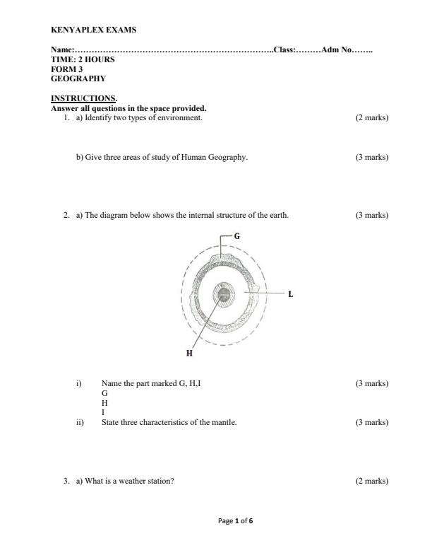 Form 3 Geography Term 1 Opener Exam 2024