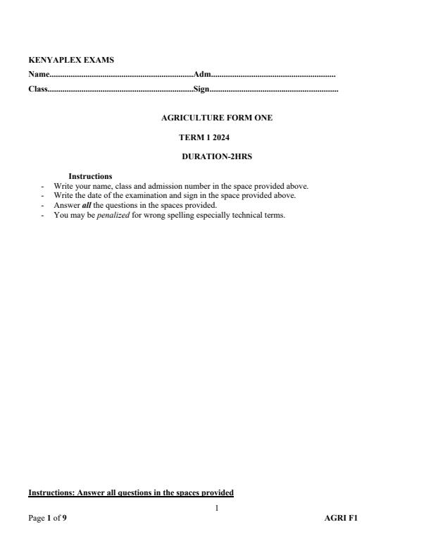Form 1 End of Term 1 Examinations 2024 - Set