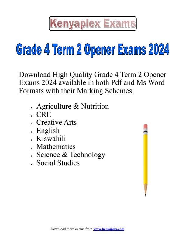 Buy High Quality Grade 4 Term 2 Opener Exams 2024 - Set available in both Pdf and Ms Word Formats with their Marking Schemes.