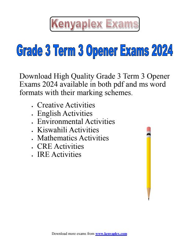 Download High Quality Grade 3 Term 3 Opener Exams 2024 available in both pdf and ms word formats with their marking schemes.