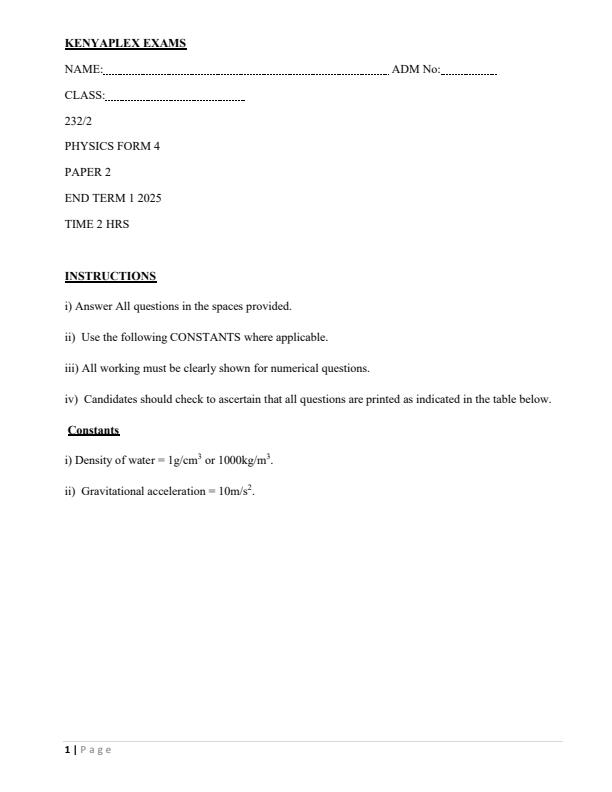 Form 4 Physics Paper 2 End of Term 1 Examination 2025