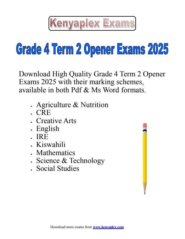 Prepare for Grade 4 Term 2 Opener Exams 2025 with our comprehensive set, including exam papers and marking schemes. Perfect for students and teachers alike, these resources ensures thorough preparation and understanding of key concepts. Boost academic success with our essential study materials.