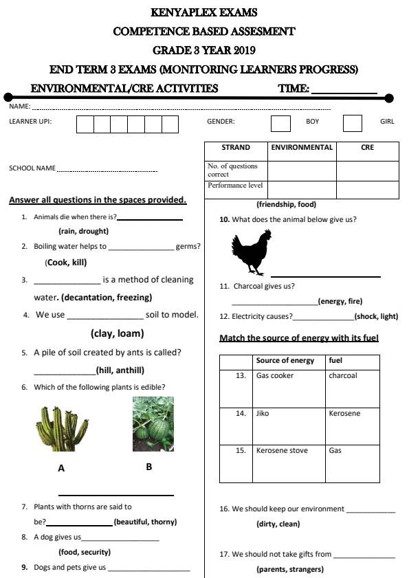 Grade 3 Environmental Activities and CRE End of Term 3 Examination 2019