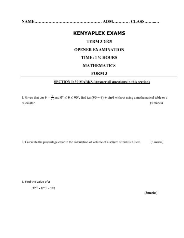 Form 3 Mathematics Term 3 Opener Exam 2025