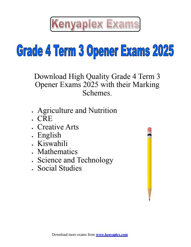 Prepare for Grade 4 Term 3 Opener Exams 2025 with this comprehensive set including exam papers and marking schemes. Perfect for teachers and students, these resources helps ensure thorough preparation and understanding of key concepts. Get ready to ace the exams with ease!