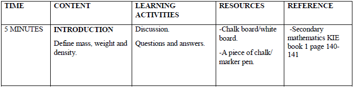 Download Form 1 Mathematics Term 2 Lesson Plans document in both MS Word and PDF formats.This document is useful to high school teachers. Please do note that the full lesson plan is only available after purchase. Find below the sub-topic covered in the lesson plan: SUB-TOPIC.-Units of mass, weight and density.