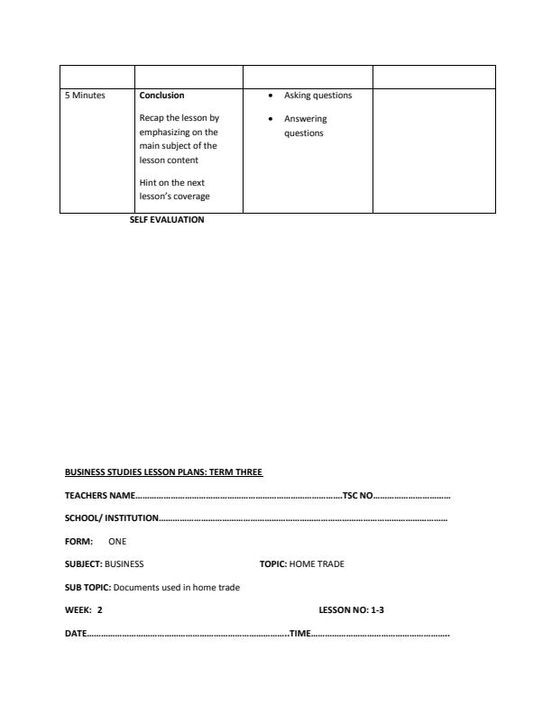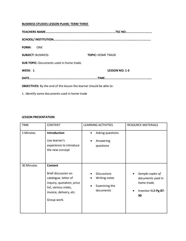Download Form 1 Business Studies Lesson Plans available in both pdf and ms word formats.