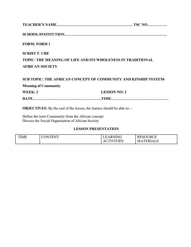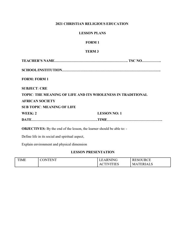 Download high quality Form 1 CRE Lesson Plans available in both pdf and word formats.