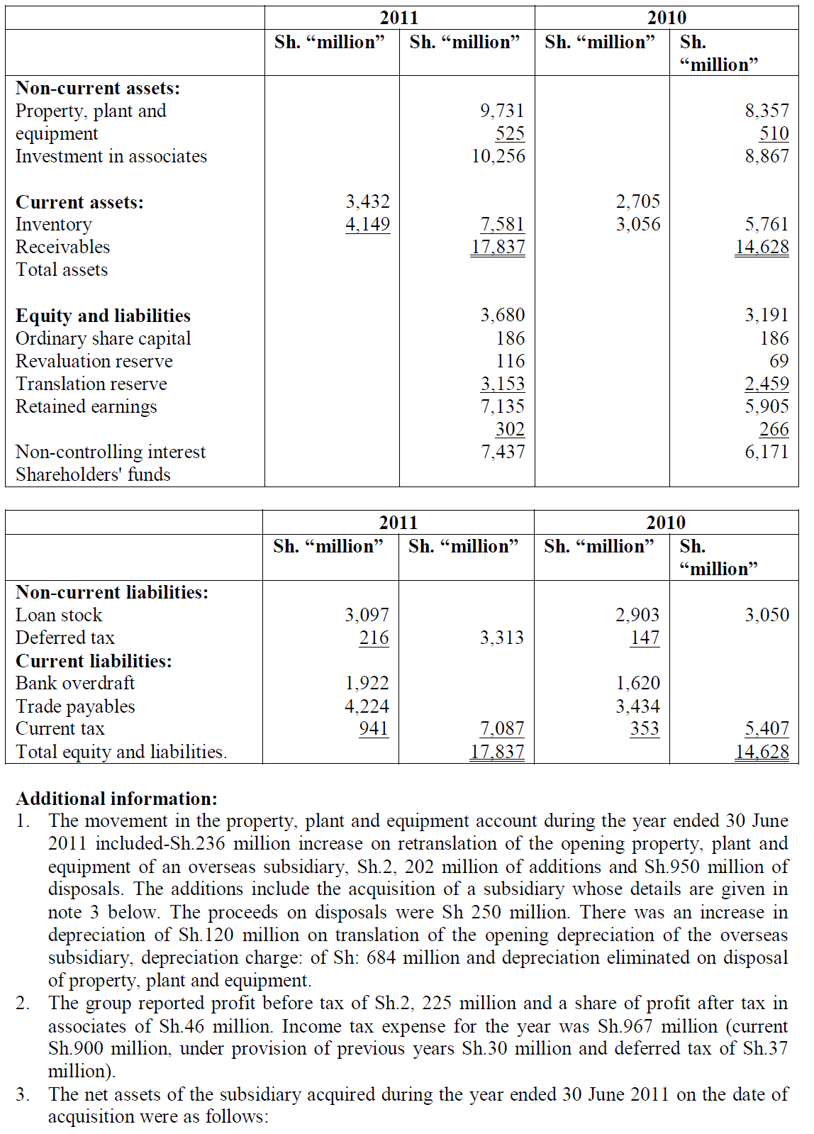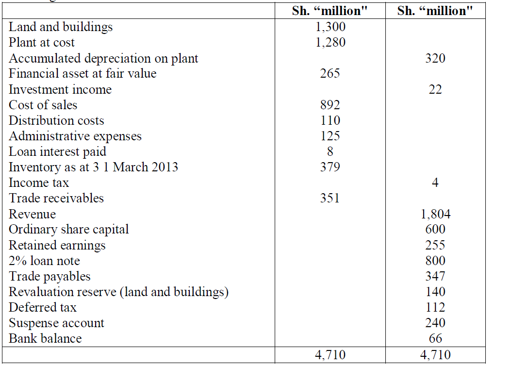 1. The value of land in the trial balance is given as Sh.300 million. The buildings were revalued on 31 March 2013 at Sh.920 million. The estimated useful life of buildings was 20 years as at 1 April 2012. Depreciation on buildings is charged at 60% to cost of sales and 20% each to distribution costs and administrative expenses.