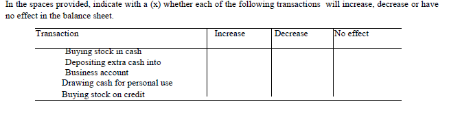 In the spaces provided write decrease, increase or no effect to show the effects of each one of the following transactions on the assets, liabilities and capital.