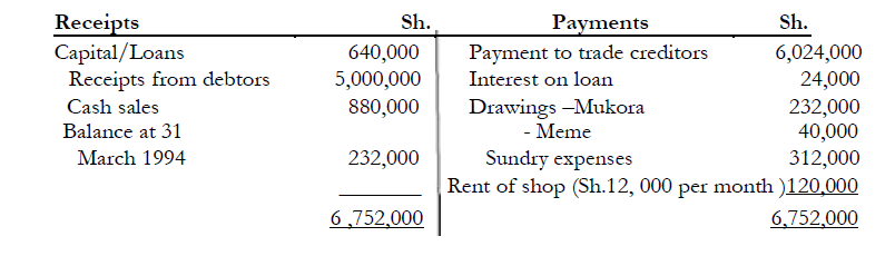 On 1 July 1994 his capital was Sh. 172,500. An analysis of his cashbook for the year to 30