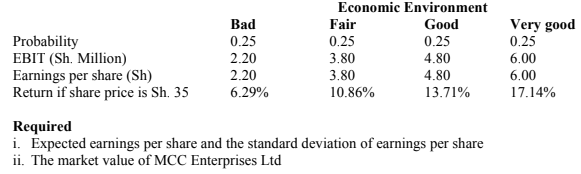 MCC Enterprises Ltd. expects its earnings before interest and taxes (EBIT) to fluctuate with the economic environment as shown below. You are advised that the earnings distribution is expected to continue in perpetuity. The company has one million shares outstanding and no debt in the capital structure. The company pays all its earnings in dividends and shareholders require a