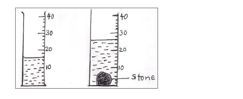 The figure below shows the volume of water in a measuring cylinder before and after immersing a stone. If the mass of the stone is 125g, determine its density