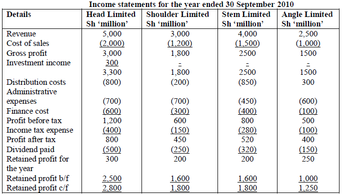 3. On 1 July 2010, Head Limited sold its investment in Shoulder Limited at a price of Sh.3,430 million. This disposal has not been reflected in the income statement of Head Limited.