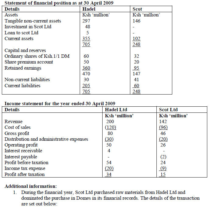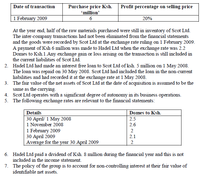 Hadel Ltd., a public limited company incorporated in Kenya owns 75% of the ordinary share capital of Scot Ltd.., a public limited company incorporated in a foreign country. The reporting currency of Scot Ltd is the domes (DM) whereas that of Hadel Ltd is the Kenya shilling (Ksh). Hadel Ltd acquired its shareholding in Scot on 1 May 2008 at 120 million domes (DM) when the retained profits of Scot Ltd were 80 million domes (DM). Scot Ltd has not revalued its assets or issued any share capital since 1 May 2008.