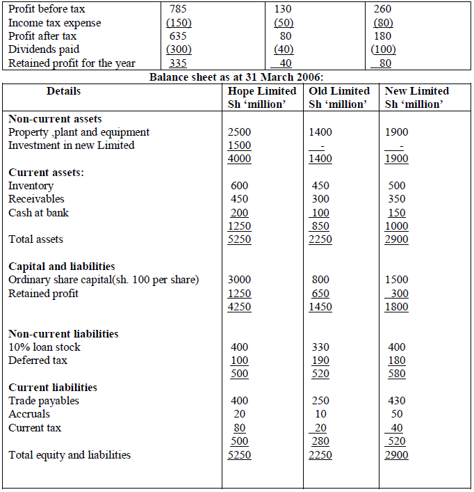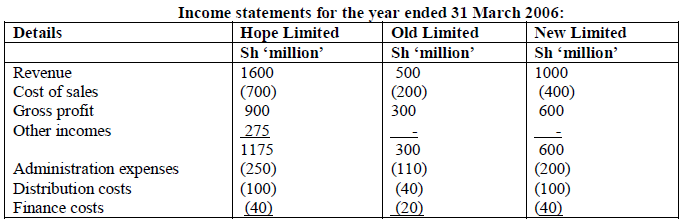 In addition, Hope Limited sold goods worth sh.200 million to New Limited in the period after New Limited’s acquisition. Hope Limited reported a profit margin of 40% on all the inter company sales. Half of these goods were still held by by the subsidiaries by 31 March 2006.