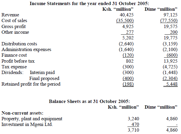 Mzalendo Ltd., a company quoted on the Nairobi Stock Exchange, ahs a foreign subsidiary, Mgeni Ltd., whose reporting currency is the Dime. The reporting currency of Mzalendo Ltd., is the Kenya shilling (Ksh.). The financial statements of the two companies for the year ended 31 October 2005 were as follows: