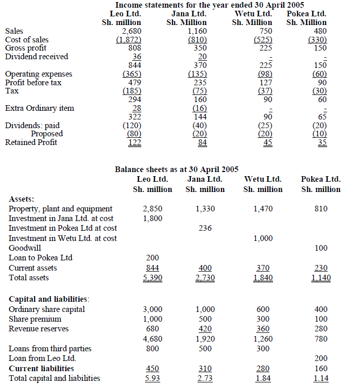 1. During the year ended 30 April 2005, Jana Ltd. made sales of Sh.500 million to Leo Ltd. at a profit of 25% on cost.Sh.50 million of these goods were include in the closing stock of Leo Ltd. Included in the opening stock of Leo Ltd., were goods purchased from Jana Ltd. 31,'1 on which Jana Ltd. had made a profit of Sh.6 million. All the intra-group opening stock was disposed of during the period.