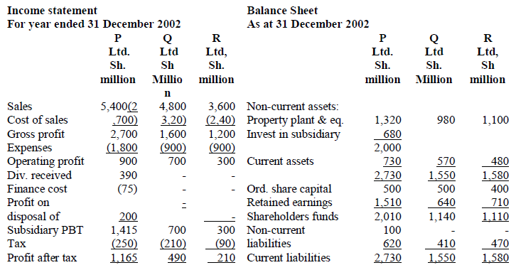 P. Limited is a company quoted on the Nairobi Stock Exchange. Its area of operations is capital equipment. It purchased 80% of the ordinary share capital of Q Limited on 1 January 1998. Q Limited is a leading producer of cement and lime in the area. P. Limited purchased 75% of the ordinary share of the capital of R Limited on 1 January 1999. R. Ltd. is a leading producer of decorative coatings. This market has suffered a major decline since the investment was made. A suitable purchaser bought the complete shareholding on 31 August 2002. The proceeds of the sale were used to repay debt on 31 August 2002. The financial statements of the companies for the year ended 31 December 2002 are as follows: