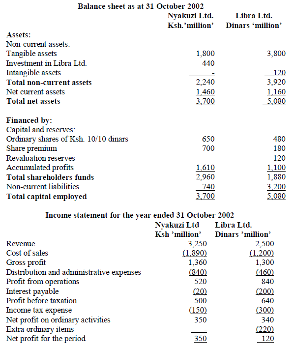 Nyakuzi Ltd., a public limited company, listed at the Stock Exchange, owns 80% of the ordinary share capital of Libra Ltd., a public limited company which is incorporated in a foreign country whose local currency is dinars.