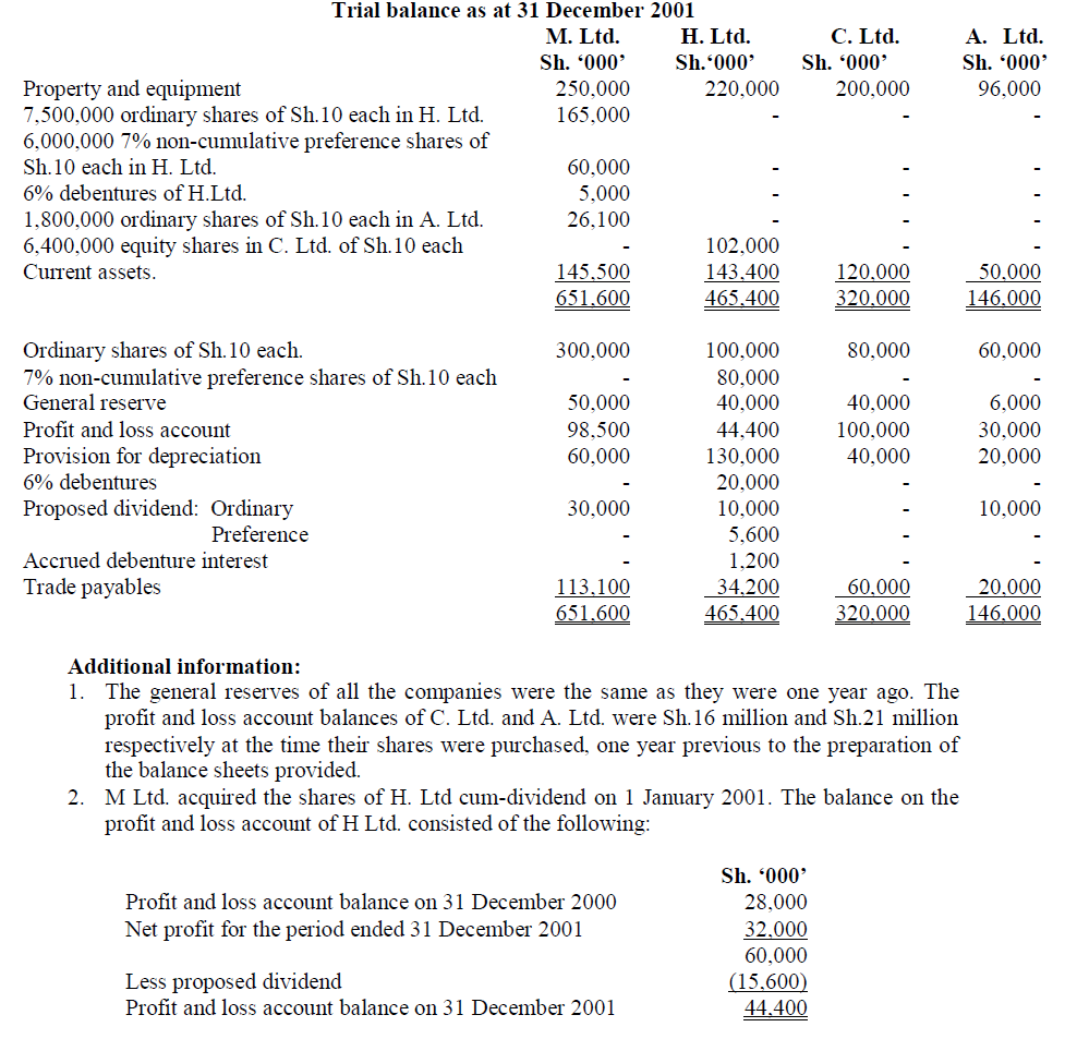 3. The balance on the profit and loss account of H. Ltd. at the acquisition date is after providing for preference dividend of Sh5.6 million and a proposed ordinary dividend of Sh.5 million, both of which were subsequently paid and credited to the profit and loss account of M. Ltd.