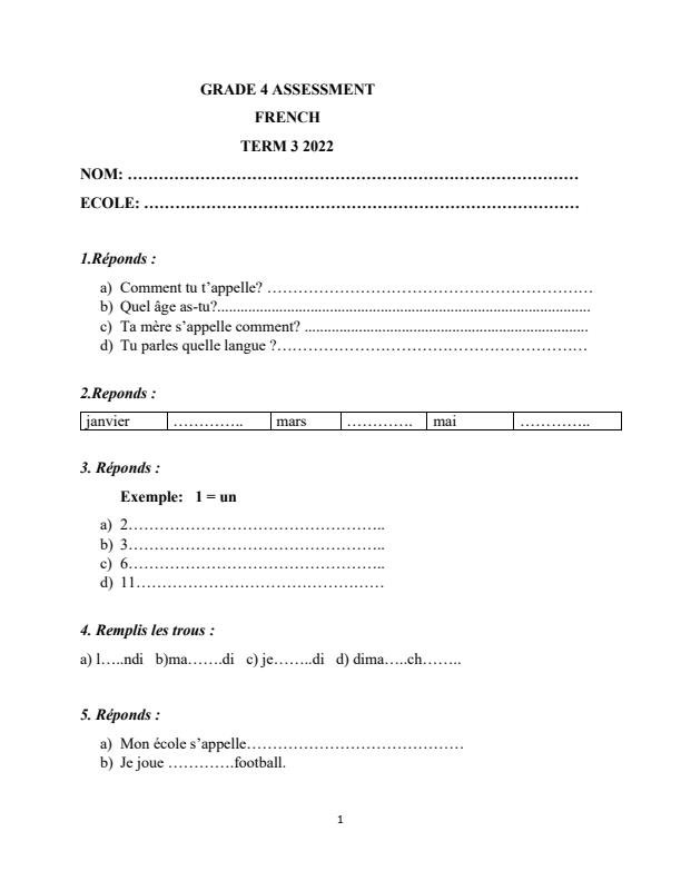 Grade 4 French question paper term 1. It assesses the content covered in class in term 1.