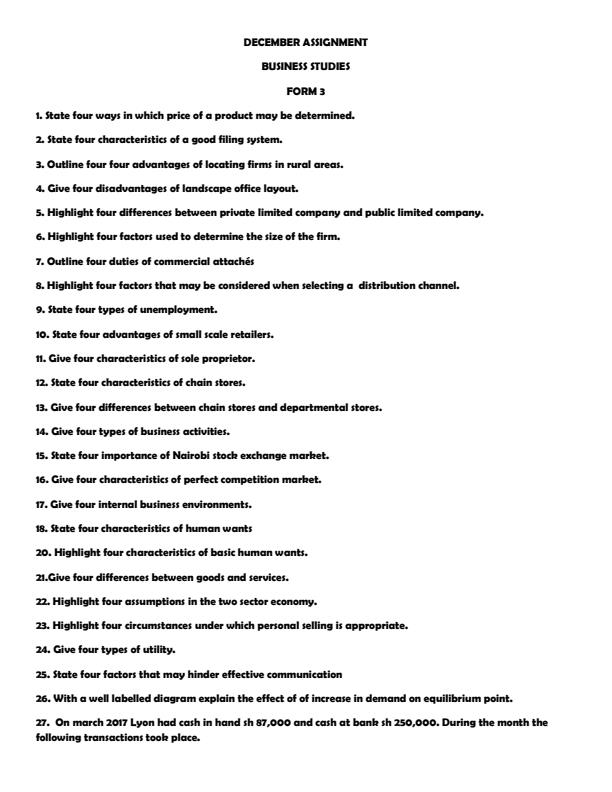 Download Form 3 Business Studies December Holiday Assignment 2022.
