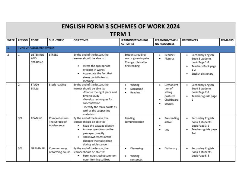 Form 3 Term 1 English Schemes of Work 2024Discover comprehensive Form 3 Term 1 English Schemes of Work for Secondary English. Perfect resource for teachers seeking structured resources.