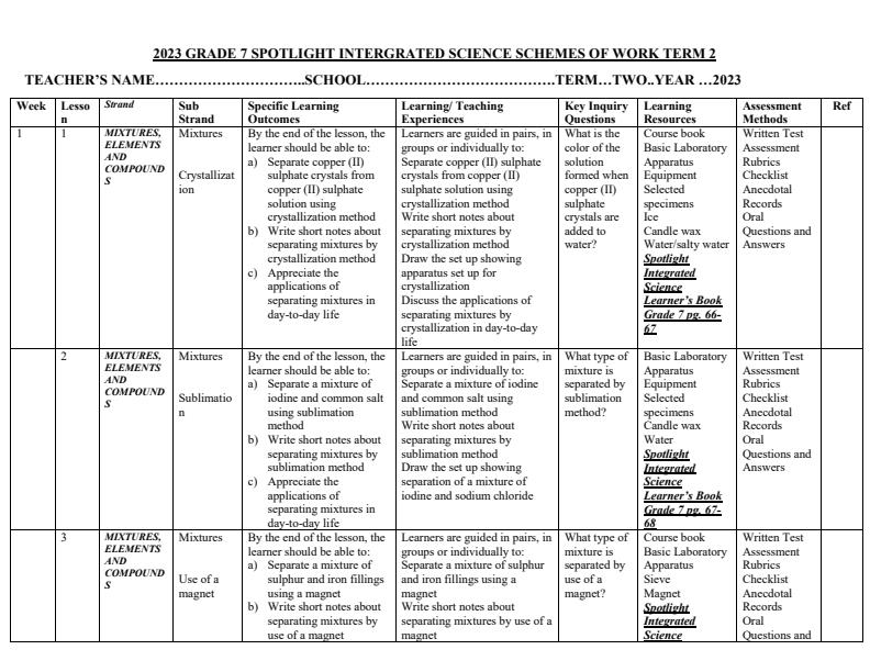 This is Grade 7 Rationalized Integrated Science Schemes of work for Term 2.This document has been prepared in line with the new rationalized curriculum design from KICD.The reference book is Grade 7 Active Integrated Science.