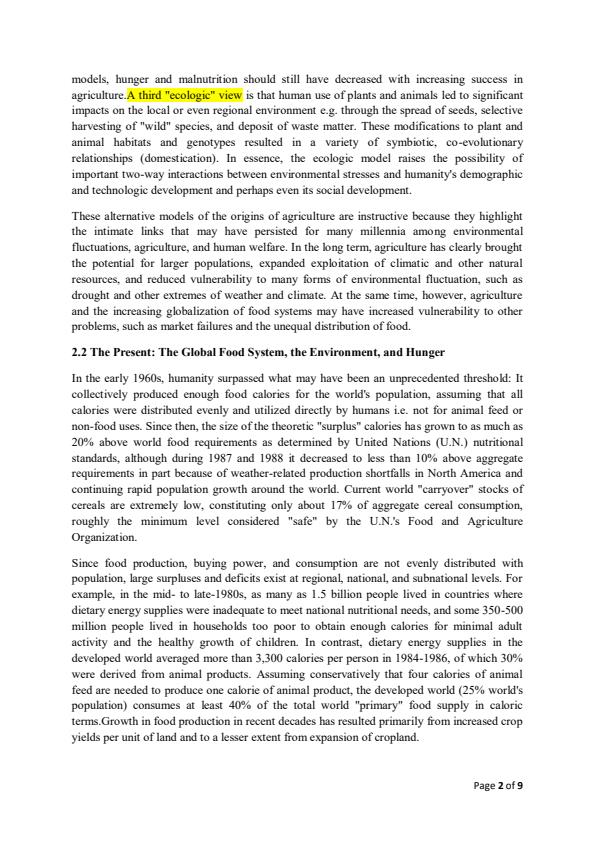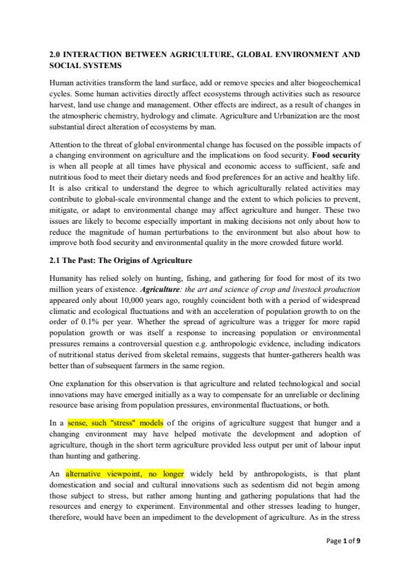 The notes comprises origin of agriculture, the global food system and its influences on environment and its mitigation measures 2.0 INTERACTION BETWEEN AGRICULTURE, GLOBAL ENVIRONMENT AND SOCIAL...