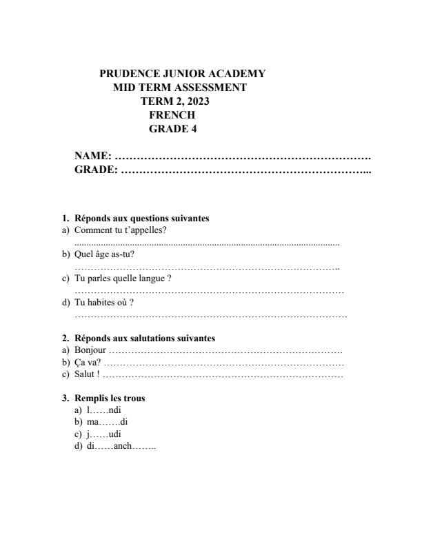 • Page 1 – Grade 4 French Assessment Mid Term 2 2023 – Kenyaplex