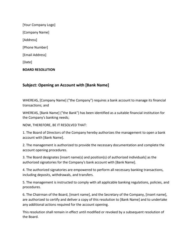 A board resolution to open a bank account is an official document adopted by a company's board of directors. It authorizes the management or designated individuals to initiate the process of opening a bank account on behalf of the company.