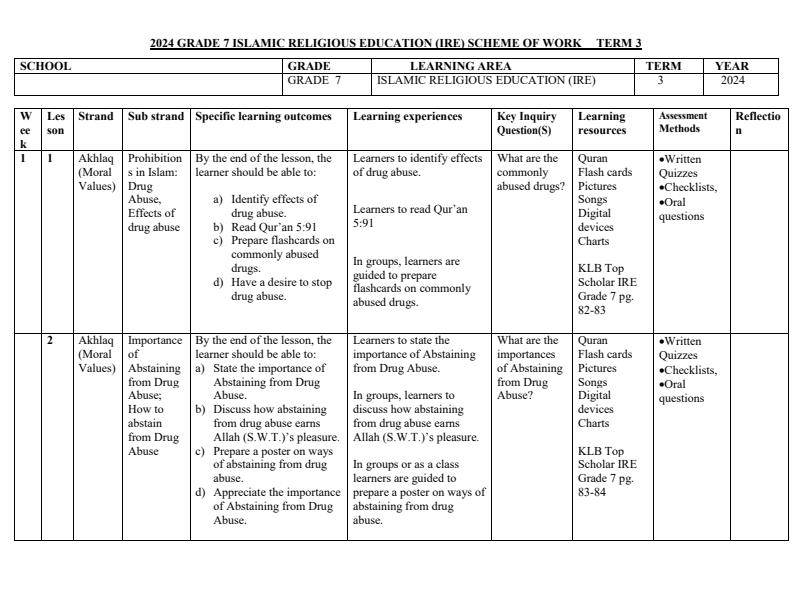Download 2024 Grade 7 C.R.E records of work Term 3.