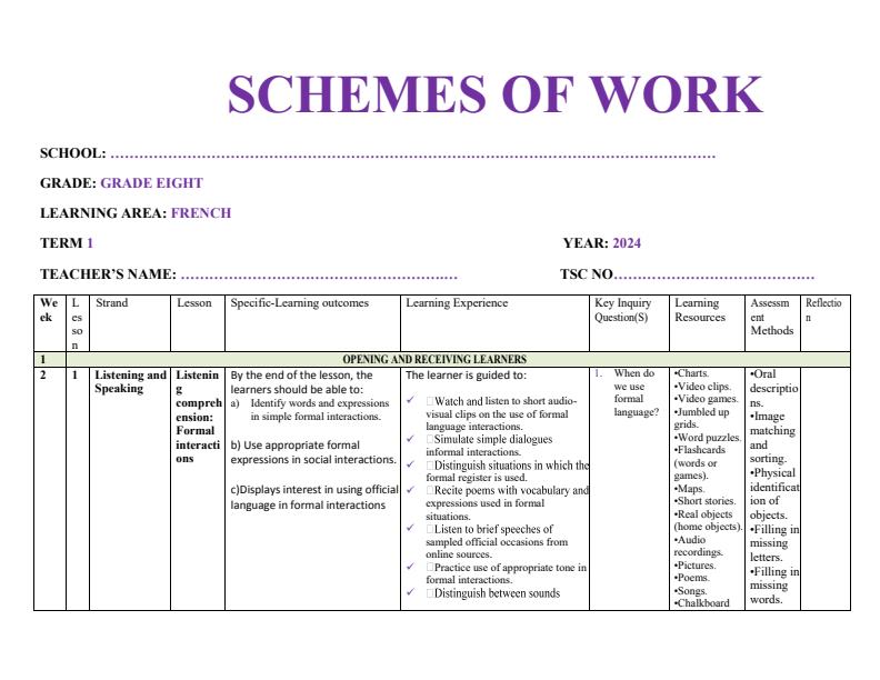 • Page 2 โ€“ Grade 8 French Schemes of Work Term 1 โ€“ Kenyaplex