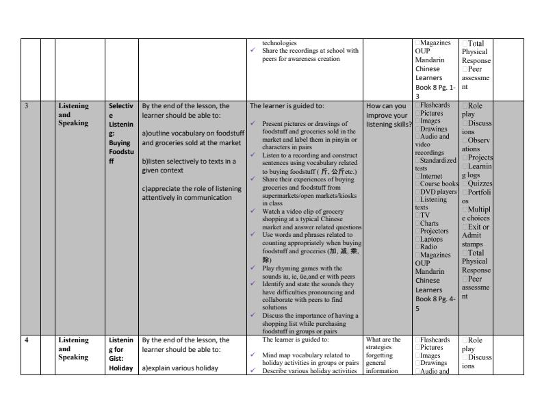 Grade 8 Mandarin Chinese Schemes of Work Term 1