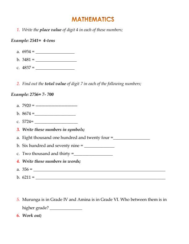 • Grade 4 Mathematics August 2024 Holiday Assignment