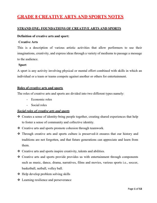 • Grade 8 Creative Arts and Sports Notes Strand 1 Notes: Foundations of Creative Arts and Sports