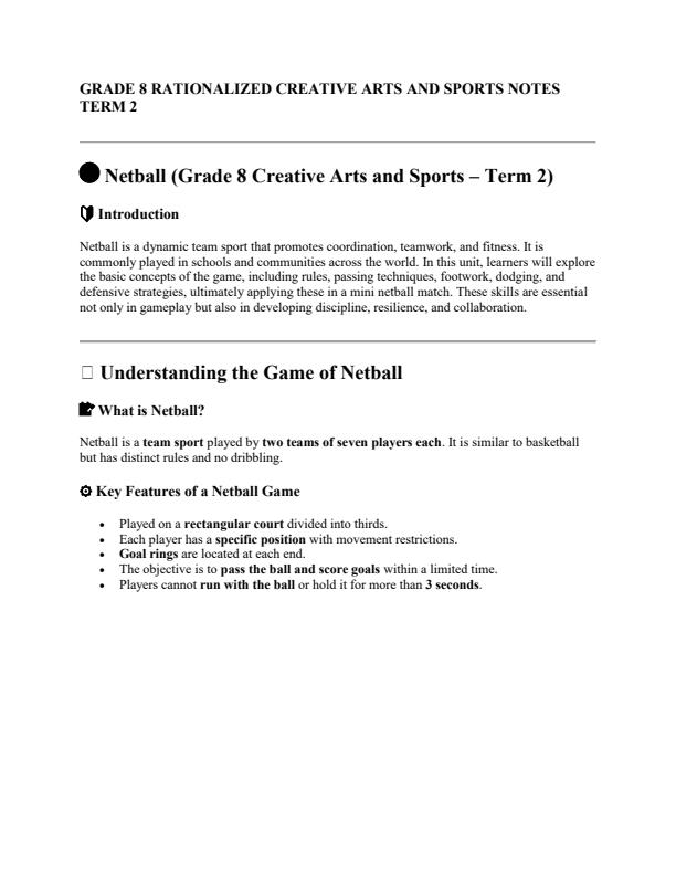 • Grade 8 Creative Arts and Sports Notes Strand 1 Notes: Foundations of Creative Arts and Sports