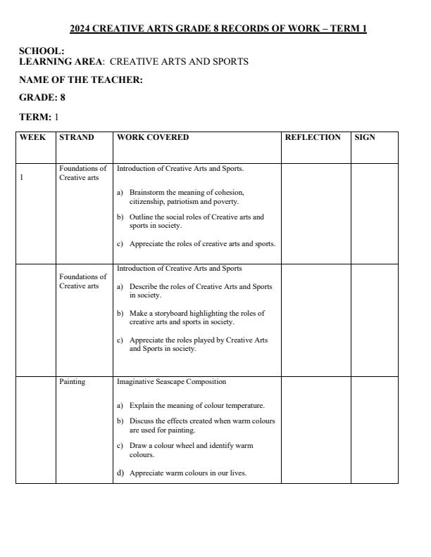 Grade 8 Rationalised Creative Arts and Sports Records of Work Term 2