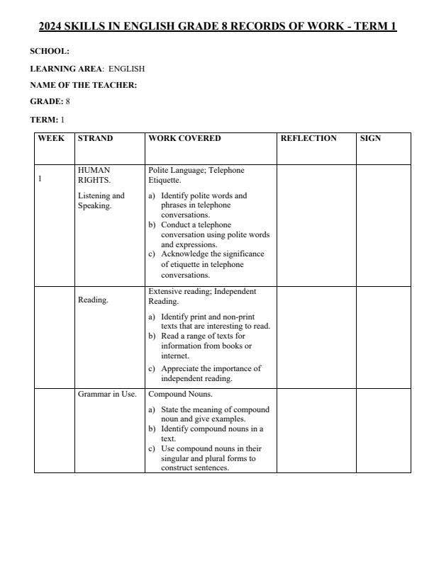 Grade 8 Rationalized Kiswahili Records of Work Term 1