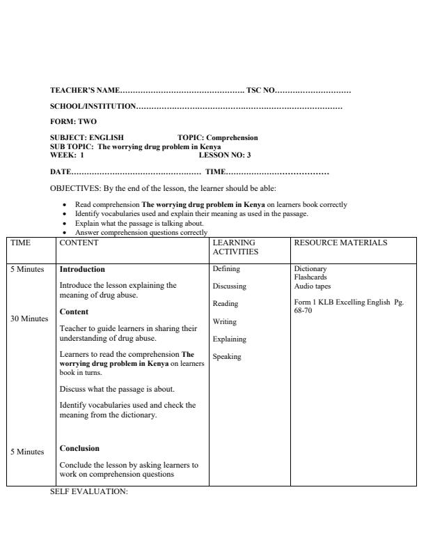 Form 1 Term 2 English Lesson Plans - KLB Excelling in English