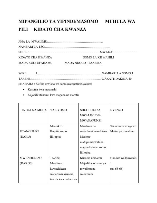 • Form 1 Kiswahili Term 2 Lesson Plans - Uhondo Wa Kiswahili