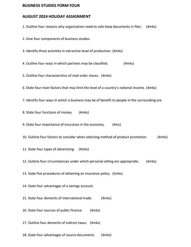 Form 4 Business Studies August 2024 Holiday Assignment