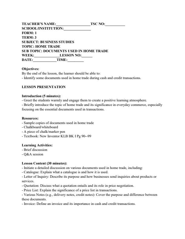 • Page 1 – Form 1 Business Studies Lesson Plans Term 3 – Kenyaplex