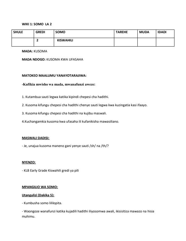• Grade 2 Kiswahili Lesson Plans Term 1 - KLB Early Grade